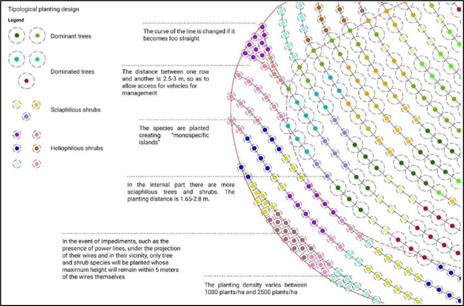 This planting design allows for better visual approximation to a natural forest. This Good Practice is focused on Urban Forest planting design, or anywhere there is a high need to recreate as much as possible a natural forest, since the objective is aesthetic and recreational. Socio-culturally, that design results in more enjoyable, natural-looking, diverse forests. Ecologically this planting distribution seems to be more friendly or less threatening to fauna (Data and results are work in progress).